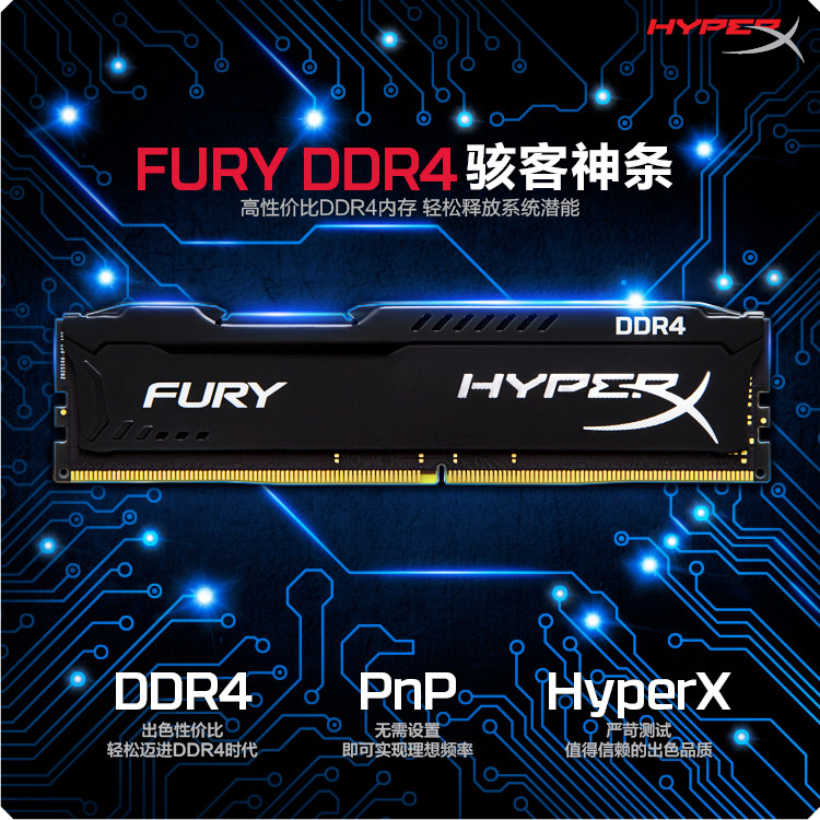 FURY DDR4 骇客神条支持PNP自动超频技术,可以帮助玩家轻松超频,提升系统性能。同时,该系列产品提供不同主频的 产品型号供您选择,包括2133MHz、2400MHz和2666MHz等。